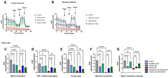 Sterubin and fisetin preserve mitochondrial bioenergetics following induction of oxytosis/ferroptosis in HT22 cells. (A,B) Mitochondrial oxygen consumption rate (OCR) profiles in HT22 cells after different treatments for 16 h. (A) OCR following fisetin treatment. (B) OCR following sterubin treatment. (C–G) Graphs for basal respiration, OCR linked to ATP production, OCR linked to proton leak, and maximal respiration and spare respiratory capacity in HT22 cells. All data were normalized to total protein/well and are the mean of 16 replicates per condition ± SD. All data were analyzed by one-way ANOVA with Tukey’s multiple comparison test. * p < 0.05, ** p < 0.01, *** p < 0.001, and **** p < 0.0001 relative to control and relative to the 50 nM RSL3 treatment; ns, not significant.