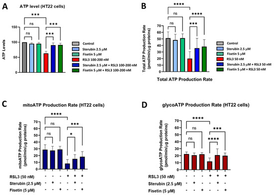 Sterubin and fisetin preserve ATP production and the metabolic phenotype of HT22 cells following induction of oxytosis/ferroptosis. (A) ATP levels in HT22 cells treated with 2.5 μM sterubin, 5 μM fisetin, 100–200 nM RSL3, 2.5 μM sterubin and 100–200 nM RSL3, 5 μM fisetin and 100–200 nM RSL3. The results are presented as the percentage of ATP levels relative to control (100%). Data are the mean of 3–4 replicates per condition ± SD. (B–D) Graphs for total ATP production rate, mitoATP production rate, and glycoATP production rate in HT22 cells. Data were normalized to total protein/well and are the mean of 16 replicates per condition ± SD. All data were analyzed by one-way ANOVA with Tukey’s multiple comparison test. * p < 0.05, *** p < 0.001, and **** p < 0.0001 relative to control and relative to the 50 and 100–200 nM RSL3 treatment; ns, not significant.