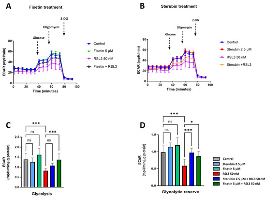 Sterubin and fisetin preserve glycolytic rate following induction of oxytosis/ferroptosis in HT22 cells. (A,B) Extracellular acidification rate (ECAR) profiles in HT22 cells after different treatments for 16 h. (A) ECAR following fisetin treatment. (B) ECAR following sterubin treatment. (C,D) Graphs for glycolytic rate and glycolytic reserve in HT22 cells. All data were normalized to total protein/well and are the mean of 16 replicates per condition ± SD. All data were analyzed by one-way ANOVA with Tukey’s multiple comparison test. * p < 0.05, and *** p < 0.001 relative to control and relative to the 50 nM RSL3 treatment; ns, not significant.