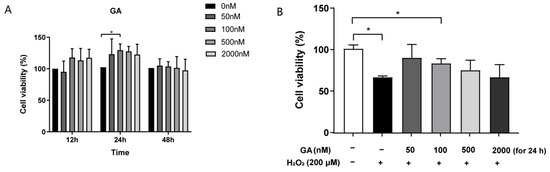Porcine IPEC-J2 cells were incubated with 200 μM of H2O2 for 8 h of induced intracellular oxidative stress [22,23,24]. We investigated the effect of exposure to 200 μM of H2O2 on the viability of IPEC-J2 cells using CCK-8 assays. We found that cell viability was significantly reduced to 70% after 8 h of incubation with 200 μM of H2O2 (p < 0.05, Figure S1A). Notably, GA did not affect the cell viability of IPEC-J2 cells when the concentration ranged from 50 nM to 2 μM with different incubation times (12 h, 24 h, and 48 h, respectively) (p > 0.05, Figure 1A). Next, we pretreated the IPEC-J2 cells with different doses of GA for 24 h to test the protective effect. As shown in Figure 1B, GA pretreatments restored the viability of oxidative stress-induced cells to the control levels (p > 0.05, Figure 1B). Notably, 24 h of incubation with 100 nM of GA significantly increased the cell viability both in the control and oxidative stress-induced IPEC-J2 cells (p < 0.05, Figure 1A,B). Thus, we treated IPEC-J2 cells with 100 nM of GA for 24 h for the remaining analyses in this study.