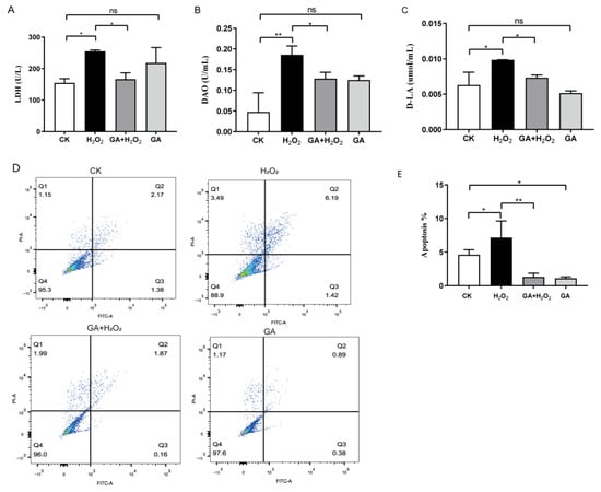 Glycyrrhetinic acid (GA) prevents oxidative stress-induced IPEC-J2 cell barrier damage and apoptosis. Cells were seeded for 24 h, pretreated with 100 nM GA for 16 h, then exposed to 200 μM H2O2 for 8 h. (A–C) Effects of GA on lactate dehydrogenase (LDH) and diamine oxidase (DAO) activity, and D-lactate (D-LA) level in IPEC-J2 cells exposed to H2O2. (D) Detection of apoptosis based on Annexin V-FITC staining and PI staining. Flow-cytometric analysis of apoptotic cells. (E) Quantification of apoptosis based on flow cytometry data. (A–C,E) Data were analyzed by one-way ANOVA and multiple comparisons with Duncan’s multiple range test. Data are presented as mean ± SEM with three independent experiments. n = 3 means three independent experiments. The differences between two groups were considered significant at * p < 0.05 and ** p < 0.01. ns indicates no difference between two groups.