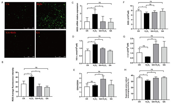 Effects of glycyrrhetinic acid (GA) on redox status of oxidative stress-induced IPEC-J2 cells. (A) The production of ROS was assessed by DCFH-DA staining and fluorescence microscopy. (B) ROS production was calculated. (C) The mRNA expression of iNOS in IPEC-J2 cells. (D–H) Effect of GA on MDA level, GSH/GSSG, SOD, CAT, and superoxide anion radical scavenging activities in IPEC-J2 cells. (B–H) Data were analyzed by one-way ANOVA and multiple comparisons were analyzed with Duncan’s multiple range test. Data are presented as mean ± SEM with three independent experiments. n = 3 means three independent experiments. The differences between two groups were considered significant at * p < 0.05 and ** p < 0.01. ns indicates no difference between two groups.