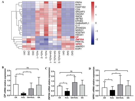 Differentially expressed up- and downregulated genes based on heat map analysis. (A) The heatmap of gene expression; the red, white, and blue colors represent the upregulated, unchanged, and downregulated differentially expressed genes in the GA + H2O2 vs. H2O2 group. (B–D) RT-qPCR validation of differentially expressed genes. (B–D) Data were analyzed by one-way ANOVA and multiple comparisons with Duncan’s multiple range test. Data are presented as mean ± SEM with three independent experiments. n = 3 means three independent experiments. The differences between two groups were considered significant at * p < 0.05. ns indicates no difference between two groups.