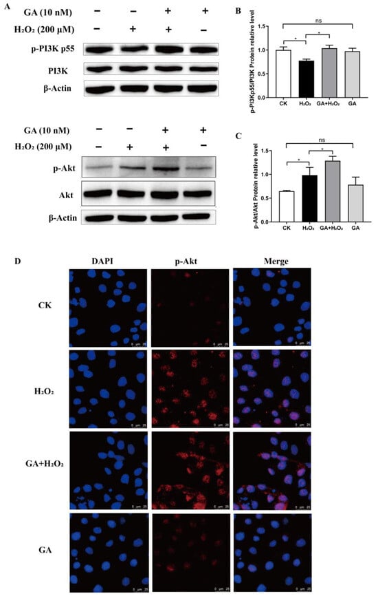 Western blot analysis was conducted to detect PI3K (p-PI3K) and Akt (p-Akt) phosphorylation levels in IPEC-J2 cells treated with GA without H2O2. However, GA alone did not affect the levels of either p-PI3K or p-Akt during steady-state conditions (without H2O2 exposure) (Figure 5A–C). Notably, under oxidative stress (with H2O2 exposure), GA pretreatment significantly increased (p < 0.05) the abundance of p-PI3K/PI3K and p-Akt/Akt, suggesting the activation of the PI3K/Akt signaling pathway (GA + H2O2 versus H2O2, Figure 5B,C). Furthermore, we characterized the subcellular localization of p-AKT by IF staining. GA pretreatment increased the abundance of p-Akt, mostly in the nucleus of H2O2-exposed IPEC-J2 cells (Figure 5D). Thus, it was conceivable that the protective role of GA in oxidative-stressed IPEC-J2 cells required the PI3K/Akt pathway.