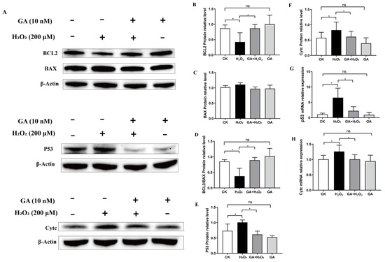 Glycyrrhetinic acid (GA) prevents oxidative stress-induced apoptosis by regulating the downstream targets of PI3K in IPEC-J2 cells. (A–F) The protein expressions of p53, Cytc, BCL2, and BAX were measured by Western blotting with specific primary antibodies, and β-Actin was used as a loading control. (G,H) The mRNA expressions of p53 and Cytc. Quantification of the relative protein expression was performed by densitometric analysis. (B–E) Data were analyzed by one-way ANOVA and multiple comparisons with Duncan’s multiple range test. Data are presented as mean ± SEM with three independent experiments. n = 3 means three independent experiments. The differences between two groups were considered significant at * p < 0.05. ns indicates no difference between two groups.