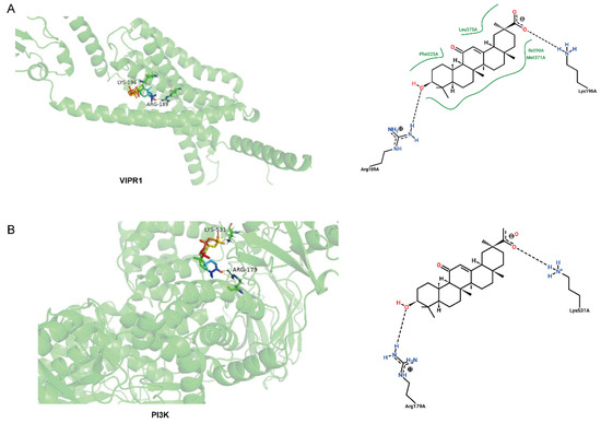 Molecular binding of glycyrrhetinic acid (GA) with VIPR1 and PI3K. (A) The 3D structure interactions of GA with VIPR1. (B) The 3D structure interactions of GA with PI3K.