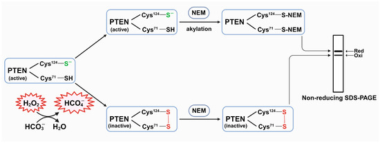 Experimental scheme for detecting redox status of PTEN by mobility shift. Upon HCO4− exposure, a proportion of PTEN can be oxidized in the Cystein124 residue of their active site through creating a reversible intracellular disulfide bond with Cystein71. Subsequently, the supplement of NEM akylates reduced PTEN to a PTEN-NEM complex, increasing the molecular weight, thereby resulting in a lower shift in non-reducing SDS-PAGE.