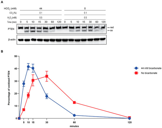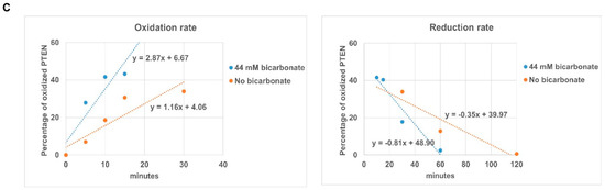 In summary, the results of our experiment support the hypothesis that the presence of HCO3− promotes the H2O2-mediated inactivation of PTEN. This subsequently promotes the activation of the PI3K/AKT signaling pathway. In addition, the reduction of oxidized PTEN by antioxidant systems is also equivalently affected. A plausible explanation could be the formation of HCO4−. CAs are prospective targets for modulating this process as they are involved in HCO3− production. In the future, further experiments would be conducted to consolidate the role of HCO4− in the redox regulation of PTEN.