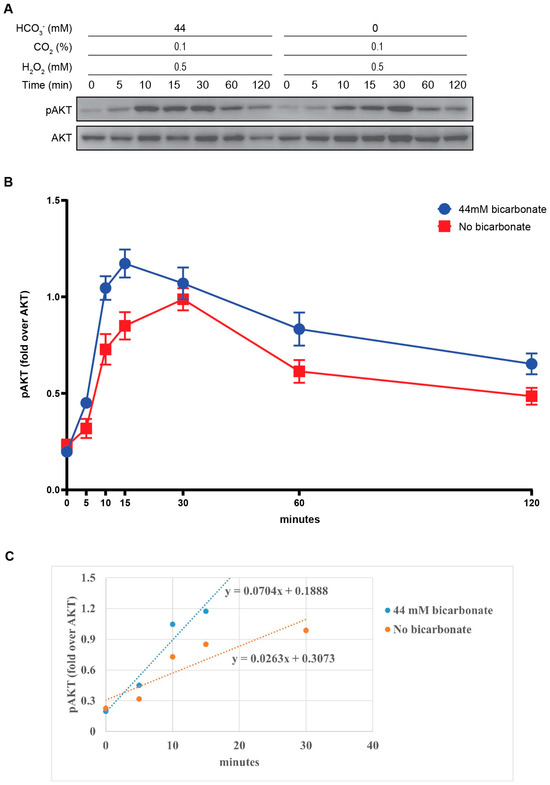 HCO3− accelerates and potentiates the phosphorylation of AKT induced by H2O2. HepG2 cells were pre-incubated and exposed to 0.5 mM H2O2 in HCO3−-supplemented or HCO3−-free media. After 5, 10, 15, 30, 60, and 120 min, cell lysates were collected and subjected to Western blot using pAKT and total AKT antibody (A). Data are quantified by the pAKT fold over total AKT and presented as mean ± SE. The combination of HCO3− and H2O2 resulted in faster and higher AKT phosphorylation than H2O2 alone (B). The linear regression trendlines of pAKT/AKT presented in (C) show that the presence of HCO3− elevated the AKT phosphorylation rate.