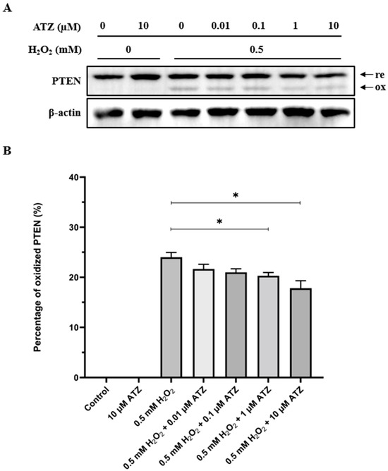 Effect of ATZ, a CA inhibitor, on oxidation of PTEN by H2O2. HepG2 cells were pre-incubated in HCO3−-free media, supplemented with 0, 0.01, 0.1, 1, and 10 µM ATZ, at 37 °C with 0.1% CO2 for 4 h. Then, they were changed to stimulation media with same components plus 0.5 mM H2O2. After 10 min, the reaction was terminated by NEM-containing lysis buffer. Western blot data with PTEN and β-actin antibodies are shown (A). ATZ considerably impeded PTEN oxidation in a dose-dependent manner (B). Stars are considered as significances (p < 0.05).