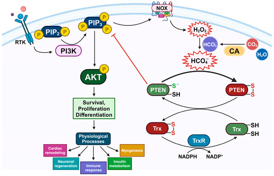 An elevated PI3K/AKT signaling pathway has been shown to be advantageous in specific physiological processes relating to tissue regeneration; thus, inhibiting PTEN, a suppressor of this pathway, has emerged as a potential therapeutic approach for ischemia, neurodegenerative diseases, infection, and insulin-resistant metabolic disorders [11,12,13]. In addition, the activation of receptor tyrosine kinases (RTKs) is a pivotal event in transmitting phosphorylation signals upon stimulation by growth factors, therefore holding substantial importance in cell physiology [30]. In this situation, a transient amount of H2O2 is generated by membrane NOXs [31]. Subsequently, H2O2 causes the reversible oxidative inhibition of PTEN, leading to an increase in PI3K/AKT downstream cascades and, consequently, eliciting cellular effects [32,33]. The oxidative inactivation of PTEN by ROS has also been demonstrated to play a significant positive role in those physiological processes demanding cell growth [34]. It can promote cardiac remodeling [35], neuronal regeneration [36], immune response [37], glucose metabolism [38], and myogenesis [39]. However, within the cellular environment, H2O2 can be eliminated by thiol proteins from the Prx family. Furthermore, oxidized PTEN and Prx can be rapidly converted back to their active reduced forms via the Trx/TrxR/NADPH system [40,41]. Thus, PTEN phosphatase catalytic activity is conserved by Trx/TrxR and Prx systems [16,17,40,42]. Yet, in this context, PTEN is inhibited during PI3K/AKT signaling pathway activation. Additionally, under RTK stimulation, CA IX undergoes phosphorylation and engages in catalyzing the conversion of CO2 to HCO3− [27]. Through our experiment results, we presume the factor that facilitates PTEN oxidation by H2O2 in the presence of HCO3− is the formation of HCO4− (Figure 6).