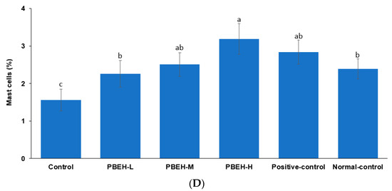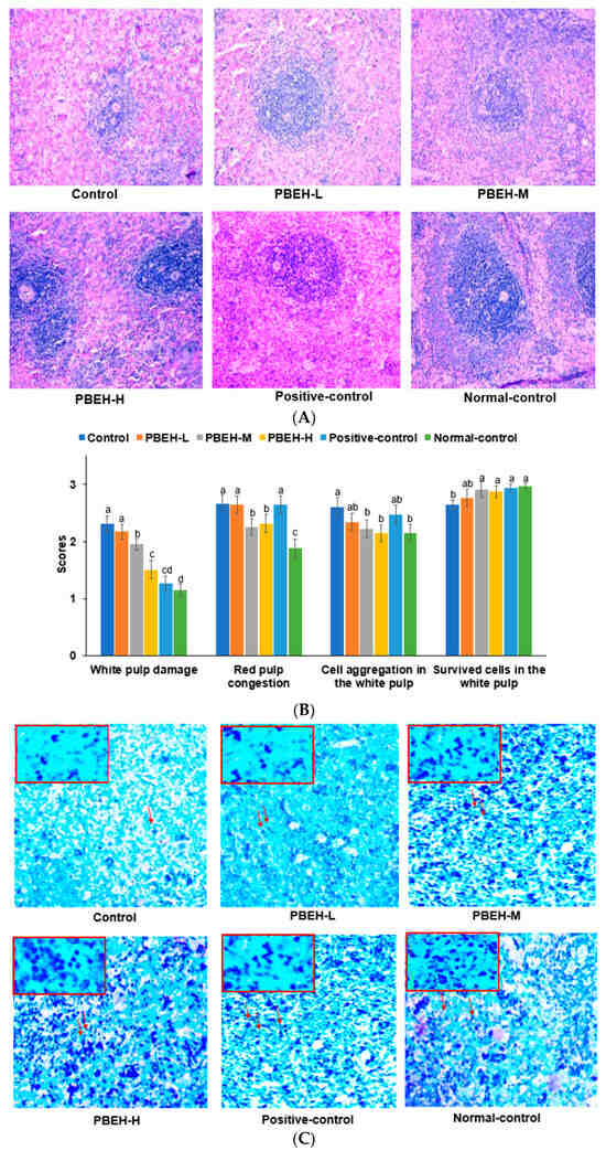 The mast cell content in the white pulp region of the spleen was diminished in the control group compared to the normal-control group (Figure 1C,D). The PBEH, positive-control, and normal-control groups showed increased mast cell content compared to the control group, and the PBEH-H group had a higher content than the normal-control (Figure 1C,D).