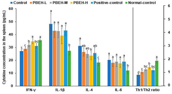 In the spleen, the IFN-γ contents were higher in the normal-control group compared to the control group and demonstrated a dose-dependent increase in the PBEH group. Notably, the PBEH-H group exhibited IFN-γ levels similar to the normal-control group. Conversely, the IL-1β and IL-6 contents in the spleen were lower in the normal-control group compared to the control group, with no significant difference observed between the PBEH and positive-control groups relative to the control group (Figure 2). The IL-4 content was higher in the control group than in the normal-control group. It was lower in the PBEH-H group than the control group but higher than the normal-control group. Moreover, the Th1/Th2 ratio calculated with the ratio of IFN-γ and IL-4 contents was notably higher in the normal-control group compared to the control group, with the PBEH-H group showing a higher ratio than the control group but lower than that of the normal-control group (Figure 2).