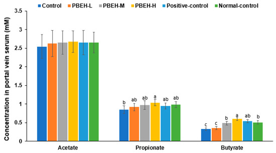 Short-chain fatty acid (SCFA) concentrations in the portal vein. Bars and error bars are presented as means ± standard deviation (n = 10). Different superscripts (a, b, c) denote significant group differences using Tukey’s test at p < 0.05.