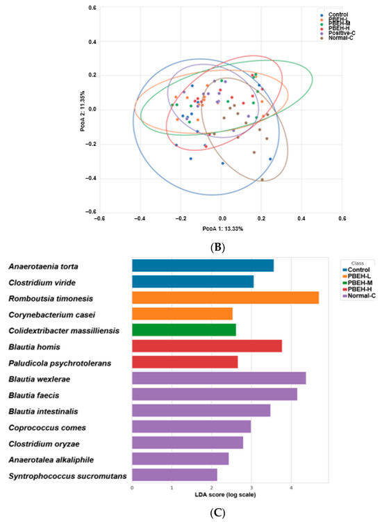 The Chao1 and Shannon indices (α-diversity index) did not reveal statistically significant differences among the control, normal-control, positive-control, and PBEH groups (Figure S3B). However, β-diversity, representing the distribution of intestinal microorganisms across groups, exhibited significant differences. Specifically, it was significantly different in the PBEH-L (p = 0.009), PBEH-M (p = 0.002), PBEH-H (p = 0.009), positive-control (p = 0.001), and normal-control (p = 0.002) groups compared to the control group. Furthermore, the β-diversity of PBEH-H differed from that of PBEH-L (p = 0.044), normal-control (p < 0.001), and positive-control (p = 0.027) groups. Additionally, it was also different in PBEH m compared to normal-control (p < 0.001) and positive-control (p = 0.044; Figure 4B). Linear discriminant analysis effect size (LEfSe) indicated the most abundant genera in each group, represented using the linear discriminant analysis (LDA) scores (Figure 4C). The control group exhibited high LDA scores for Anaerotenia torta and Clostridium viride, the PBEH-L group showed high LDA scores for Romboutsia timonensis and Corynebacterium casei, the PBEH-M group had a high LDA score for Colidextribacter massiliensis, the PBEH-H group had high LDA scores for Blautia hominis and Paludicola psychrotolerans. The normal-control group showed high LDA scores for Blautia wexlerae, Blautia faecis, Blautia intestinalis, Coprococcus comes, Anaerotalea alkaliphila, and Syntrophococcus sucromutans (Figure 4C).