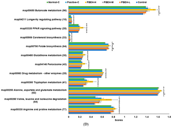 The PICRUSt analysis revealed minimal differences in microbial function between the control and normal-control groups. However, compared to the control group, the PBEH-H group demonstrated the activation of mechanisms involved in xenobiotic metabolism (Figure 4D). Amino acid metabolism, butanoate metabolism, glutathione metabolism involved in antioxidant defense, and synthesis of folate and carotenoids associated with antioxidant properties were enhanced in the PBEH-H group (Figure 4D). Thus, metagenome function in the PBEH-H group mainly improved antioxidant defense in an immunodeficient animal model.