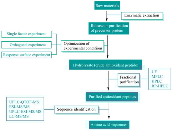 Preparation of natural antioxidant peptides via enzymatic hydrolysis. UF: ultrafiltration; MPLC: medium-pressure liquid chromatography; HPLC: high-performance liquid chromatography; RP-HPLC: reverse-phase high-performance liquid chromatography; UPLC-QTOF-MS: ultrahigh-performance liquid chromatography tandem quadrupole time-of-flight mass spectrometry; ESI-MS/MS: electrospray ionization mass spectrometry; UPLC-ESI-MS/MS: ultrahigh-performance liquid chromatography; LC-MS/MS: liquid chromatography tandem mass spectrometry.