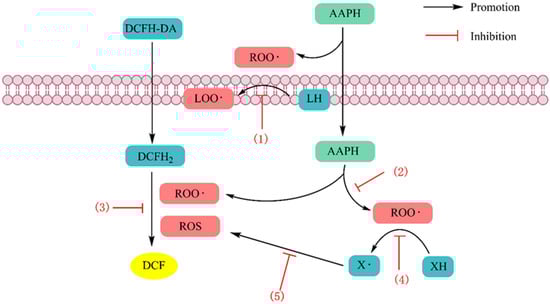 Schematic diagram of the cell antioxidant activity assay (CAA). DCFH-DA: 2′,7′-dichlorofluorescin diacetate; DCFH: 2′,7′-dichlorodihydrofluorescein DCF: 2′,7′-dichlorofluorescein. DCFH-DA is a universal indicator of oxidative stress; it has cell membrane permeability and does not produce fluorescence. Once in the cell, DCFH is hydrolyzed by cell esterase to produce DCFH, which is then oxidized rapidly to produce the strong fluorescent product DCF. Antioxidant peptides can protect DCFH2 from oxidation into DCF by free radicals through the following mechanisms: (1) scavenging ROO· in the membrane to reduce lipid peroxidation; (2) reacting with AAPH to prevent the formation of ROO; (3) competing with DCFH2 for oxidants; (4) reacting with ROO· to avoid other free radicals; and (5) inhibiting the redox reaction that produces ROS and prevents DCF production.
