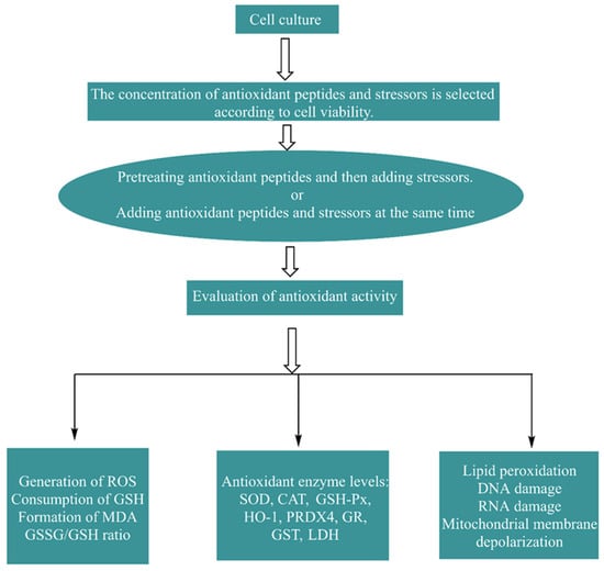Compared with chemical methods, cell models can reveal the effects of natural antioxidant peptides under physiological conditions more comprehensively. Since animal models and human clinical trials are expensive, time consuming, and complex, cellular antioxidant testing is an effective tool for initially evaluating or screening target natural antioxidant peptides before conducting in vivo experiments. The protective effect of natural antioxidant peptides on damaged cells may further reflect the mechanism by which peptides exert protective effects against oxidative stress.