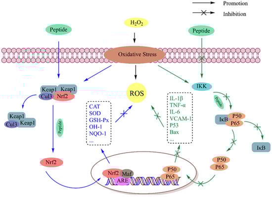 The antioxidant defense system consists of antioxidant enzymes (e.g., SOD, CAT, and GSH-Px) and other low-molecular-weight antioxidants (e.g., ascorbic acid, vitamin E, and glutathione). SOD and CAT are two common endogenous antioxidant enzymes that can convert O2•− into O2 and H2O to resist oxidative stress in vivo. As a product of lipid peroxidation, MDA can destroy the structure and function of cells and indirectly reflect the degree of oxidative stress injury. Ma et al. [44] reported that the mechanism by which soybean peptides underwent intracellular antioxidation and detoxification was related to nonenzymatic and enzymatic defense systems. The researchers used AAPH-induced erythrocyte hemolysis to study the cellular antioxidant activity of a 1 kDa soybean peptide. The results showed that the soybean peptide could significantly restore the activities of intracellular SOD, GSH-Px, and CAT; inhibit the production of intracellular MDA; and prevent the consumption of GSH. Li et al. [45] reported that porcine plasma antioxidant peptide (EDEQKFWGK) strengthened the oxidative defense system of HepG2 cells by diminishing the levels of reduced ROS and MDA and increasing the activities of antioxidant enzymes (SOD, CAT, and GSH-Px). The cell membrane is mainly composed of lipid conjugates, especially polyunsaturated fatty acids, and easy to oxidize. Hu et al. [46] reported that low-molecular-weight peptides from grass carp scale antioxidant peptides can increase the potency of the activities of SOD, CAT, and GSH-PX; decrease the levels of ROS and MDA; and reduce the damage to DNA and the cell membrane. Wang et al. [47] studied the cytoprotective effects of the antioxidant peptide from Antarctic krill (Euphausia superba) hydrolysate on H2O2-induced oxidative stress in Chang hepatocytes and identified two peptides, LKPGN and LQP, that could effectively scavenge excessive ROS, increase the content of SOD and GSH-Px, reduce the levels of MDA, and reduce oxidative-damage-induced apoptosis by inhibiting mitochondrial membrane potential.