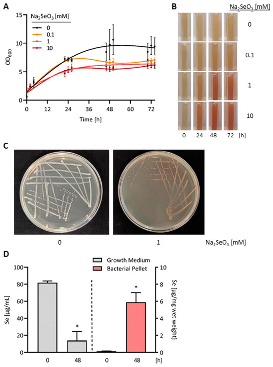 Accumulation of red elemental selenium in selenite-treated E. coli bacteria. (A) E. coli OP50 bacteria were grown in DYT medium supplemented with different concentrations of sodium selenite. Bacterial growth was assessed by measuring the optical density (OD) of the E. coli suspensions at 600 nm at the indicated time points. Data are shown as means ± S.E.M. from three independent experiments. (B) Representative photographs, showing aliquots of the selenite-treated E. coli suspensions in cuvettes. (C) Photographs of E. coli OP50 bacteria streaked on LB agar plates without added selenite (left plate) or supplemented with 1 mM selenite (right plate) and grown at 37 °C for 48 h. (D) E. coli OP50 bacteria were grown for 48 h in DYT medium supplemented with 1 mM sodium selenite. Se contents of the growth medium and the bacterial pellet were measured by total reflection X-ray fluorescence spectrometry (TXRF) at the beginning and at the end of the experiment. Data are depicted as means ± S.E.M. from three independent experiments; statistical analysis was performed using a paired t-test (* p < 0.05).