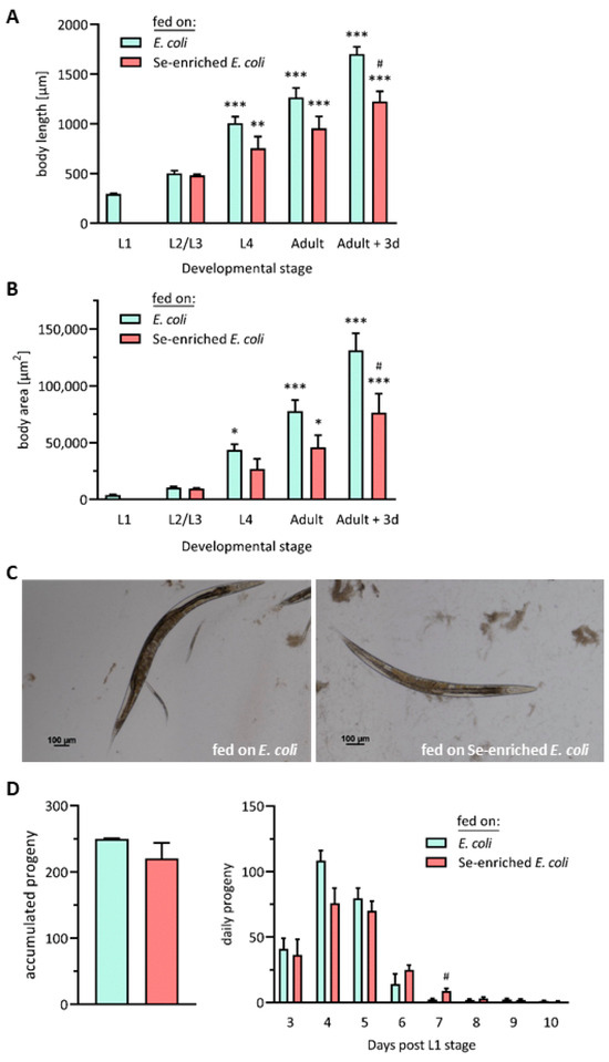 Starting at L1 stage, the growth of nematodes of the Bristol N2 (wild-type) C. elegans strain was monitored until day 3 after reaching adulthood (day 6 post-L1 stage) by consecutive measurements of their body length and area. As expected, both the body length and area of the nematodes strongly increased over the sequence of their developmental stages. However, these increases were more pronounced in the group receiving the standard E. coli OP50 diet, as compared to the worms fed on Se-enriched bacteria. Growth retardation of nematodes fed on the Se-enriched bacteria was observed for the first time at the L4 stage, even though the difference in body length and area between the two groups did not reach statistical significance before day 3 of adulthood (Figure 2A,B). From their outward appearance, adult worms who had received the Se-enriched bacteria looked generally smaller and slimmer (Figure 2C). Chronic sublethal Se toxicity has been reported to induce changes in the transcriptome of C. elegans, pointing to responses to oxidative and endoplasmic reticulum (ER) stress, as well as to impaired production of collagen and cuticle components [46]. This may explain the growth retardation observed here, as well as in studies where nematodes were exposed to high sublethal doses of selenite [23,41]. Moreover, there are several reports of lowered growth rates and body weight gain after feeding mammalian model organisms high doses of Se compounds [7]. Molecular mechanisms that are proposed to underlie Se toxicity comprise oxidative stress due to an increased production of reactive oxygen species (ROS) and glutathione depletion, suppression of methylation reactions due to depletion of S-adenosylmethionine (SAM) and reaction of Se with thiol moieties in proteins [6].
