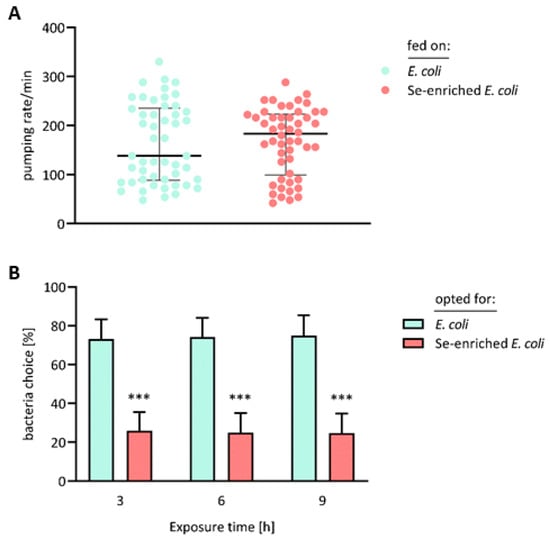 Food intake and preference of C. elegans fed on Se-enriched bacteria, as compared to the standard E. coli diet. (A) Bristol N2 worms, starting at L1 stage, received either the standard or the Se-enriched E. coli OP50 diet for 4 days. Thereafter, the pumping rate of 50 nematodes from each group was determined by recording videos of their pharyngeal movements under a microscope. Data are depicted as medians with interquartile ranges; there was no significant difference between the two groups, as shown by statistical analysis using an unpaired t-test with Welch’s correction. (B) Bristol N2 worms at the L1 stage received the standard E. coli OP50 diet for 4 days. Thereafter, they were placed in the epicenter of an agar plate, with lawns of E. coli OP50 and Se-enriched E. coli OP50 bacteria at opposite sections. For calculation of the relative bacteria choice by the nematodes, the total number of the transferred worms, as well as the number of worms which had opted for one of the food sources, was counted at the beginning of the experiment and after 3, 6 and 9 h, respectively. Data are depicted as means ± S.E.M. from four independent experiments; statistical analysis was performed using an unpaired t-test with Welch’s correction (*** p < 0.001 vs. worms fed on the standard E. coli diet).