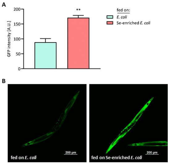 Elevated levels of the Se-binding protein SEMO-1 in C. elegans fed on Se-enriched E. coli bacteria. The transgenic C. elegans strain LOK158, overexpressing GFP-tagged SEMO-1 under control of the semo-1 promoter, was supplied with either the standard E. coli OP50 diet or with Se-enriched E. coli OP50 for three days, starting at L1 stage. (A) GFP intensity, given as arbitrary units (A.U.), was determined by fluorescence microscopy, analyzing 20 worms from each group. Data are depicted as means ± S.E.M. from three independent experiments; statistical analysis was performed using an unpaired t-test with Welch’s correction (** p < 0.01). (B) Representative photographs of nematodes that received the standard E. coli OP50 diet (left panel) or Se-enriched E. coli OP50 (right panel).