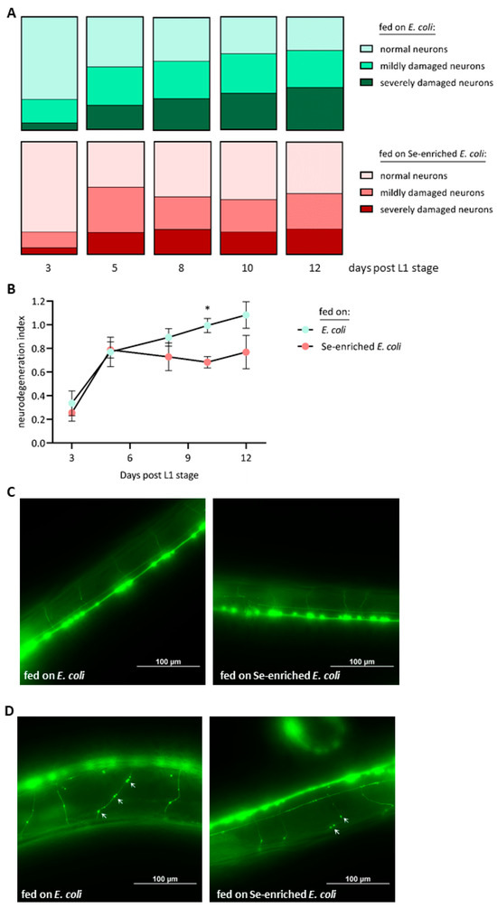 The cholinergic neurons of the nematodes were visualized by fluorescence microscopy at consecutive points in time, from day 3 to day 12 after L1 stage. In this period, the fraction of normal neurons without any visible damage dropped from 73% to 29% in the worms fed the standard E. coli diet, while the fraction of neurons with severe defects (multiple knots and ruptures) continuously rose from 6% to 38% (Figure 5A). In comparison, delayed and lower occurrence of morphological defects of the cholinergic neurons and better preservation of undamaged neurons were observed in the group of worms fed on Se-enriched bacteria. In these worms, the fraction of severely damaged neurons rose from 6% to 23% only, and the fraction of normal neurons dropped from 80% to 46% within the period of record (Figure 5A). This neuroprotective effect of the Se-enriched bacteria is reflected in the calculated neurodegeneration index, which was lower for the group of worms fed on Se-enriched bacteria from day 8 post-L1 on, even though the difference between the two groups reached statistical significance only at day 10, due to high standard deviations (Figure 5B). Generally, the cholinergic neurons of young nematodes at day 3 post-L1 showed hardly any morphological defect, independent of their diet (Figure 5C). On the other hand, aged nematodes held on Se-enriched bacteria for 12 days since their L1 stage showed less signs of degeneration, as compared to aged nematodes supplied with the standard E. coli diet (Figure 5D).