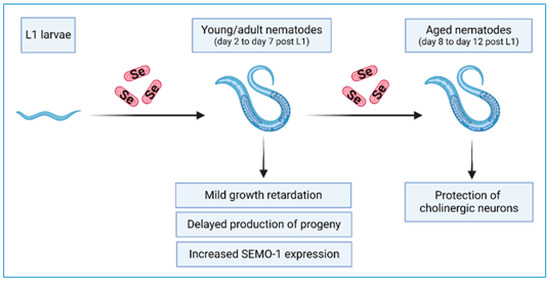Effects of a diet of Se-enriched E. coli OP50 bacteria on young/adult and aged C. elegans observed in this study. Scheme created with Biorender.com (accessed on 15 April 2024).
