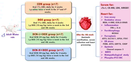 Twenty-eight adult male 6–8-week-old Wistar albino rats, weighing 170 ± 40 g, were randomly allocated into four equal groups (Figure 1). Group I (CON) received 1% carboxymethylcellulose (vehicle) daily by oral gavage for four weeks and intraperitoneal injection (i.p.) of saline twice a week in the 3rd and 4th weeks. Group II (DOX) received the vehicle by oral gavage for four weeks and i.p. of DOX (10 mg/kg) twice a week in the 3rd and 4th weeks [18]. Group III (DCN-L+DOX) received DCN (25 mg/kg) daily by oral gavage for 4 weeks with concomitant i.p. DOX injection (10 mg/kg) twice a week in the 3rd and 4th weeks. Group IV (DCN-H+DOX) received DCN (50 mg/kg) daily by oral gavage for 4 weeks with concomitant i.p. DOX injection (10 mg/kg) twice a week in the 3rd and 4th weeks. The dosage of DCN, at 25 and 50 mg/kg/day, has been determined based on a prior study demonstrating its tissue-protective effects [19]. The animal study protocol was approved by the Medical Research Ethics Committee, Faculty of Medicine, Tanta University (code: 36264PR266/7/23).