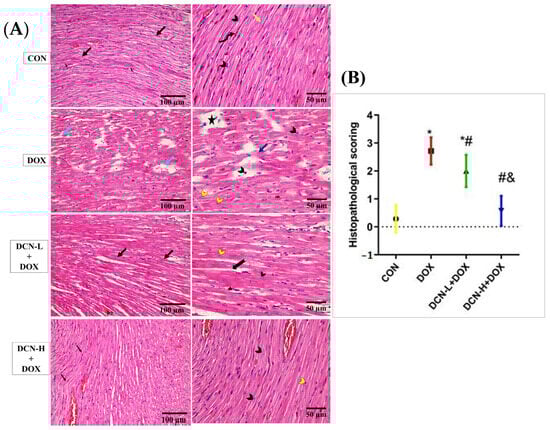 Modulatory effect of DCN on histopathological analysis of heart tissue. (A) In light microscopic images of all research groups, the CON group demonstrates normal cardiac muscle in the longitudinal section with a syncytium of branching and anastomosing myocardial fibers (black arrows). On higher magnification, the central nuclei (arrowhead), blood capillaries (V), and some lipofuscin granules are seen near the nuclei (curved arrow), with flat fibroblasts forming the interstitial space (green arrow). The (DOX) group demonstrates disorganized myocardial fibers with degenerative changes (blue arrow) in the form of focal disturbance of some myocardial fibers (dark blue arrow), interstitial edema in between the disrupted cardiomyocytes, and pyknotic and karyolitic nuclei (black and yellow arrowheads, respectively). Areas of sarcoplasmic vacuolation (star) are observed. The DCN-L+DOX group demonstrates some degree of enhancement as organized myocardial fibers (black arrow) with central vesicular nuclei (black arrowhead). However, the area of hemorrhage (hg), distribution of some fibers (bifid arrow), and karyolitic nuclei (yellow arrowhead) of some cardiomyocytes are still observed. The DCN-H+DOX group demonstrates apparent enhancement where they display normal acidophilic sarcoplasm (black arrow) and central vesicular nuclei (black arrowhead), but pyknotic nuclei in a few cells (yellow arrowhead) and congested blood capillaries (V) are still observed. (B) Histopathological score of heart injury, significant at p-value < 0.05. Values are expressed as mean ± SD, with 7 rats in each group. * Significant vs. CON group, # significant vs. DOX group, & significant vs. DCN-L+DOX group (H&E ×200, scale bar = 100 μm, H&E ×400, scale bar = 50 μm). CON: control; DOX: doxorubicin; DCN-L: diacerein low dose; DCN-H: diacerein high dose.