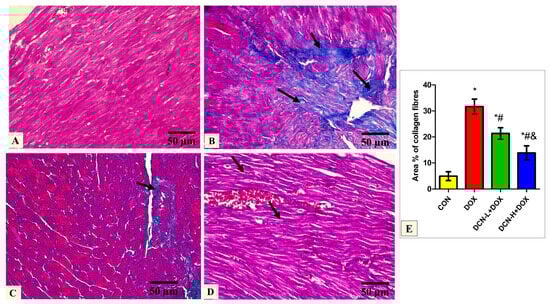 Modulatory effect of DCN on Masson’s trichrome staining heart tissue. (A) The CON group demonstrates sparse collagen fibers in between the cardiomyocytes. (B) The DOX group displays plentiful collagen fiber (arrows) deposition in between the cardiomyocytes. (C) The DCN-L+DOX group shows moderate collagen fibers (arrows) between cardiomyocytes and around the blood capillaries. (D) The DCN-H+DOX group demonstrates minimal collagen fibers (arrows) between the cardiomyocytes. (E) Area percentage of collagen fibers in all groups. (Masson’s trichrome stain ×400, scale bar = 50 μm). p < 0.05, values expressed as mean ± SD (n = 7), * significant vs. CON group, # significant vs. DOX group, & significant vs. DCN-L+DOX group. CON: control; DOX: doxorubicin; DCN-L: diacerein low dose; DCN-H: diacerein high dose.