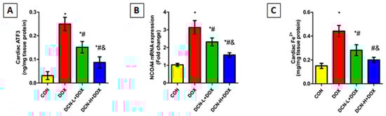 Cardiac ATF3, NCOA4-mediated ferritinophagy, and ferrous iron content among different studied groups. (A) Cardiac ATF3 (ng/mg tissue protein). (B) NCOA4 relative gene expression. (C) Cardiac Fe2+ (mg/mg tissue protein). CON, control; DOX, doxorubicin; DCN-L, diacerein low dose; DCN-H, diacerein high dose; ATF3, activating transcription factor 3; NCOA4, nuclear receptor co-activator 4. p < 0.05, values expressed as mean ± SD (n = 7), * significant vs. CON group, # significant vs. DOX group, & significant vs. DCN-L+DOX group.
