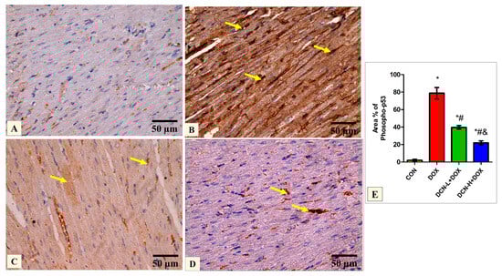 Quantitative analysis of the mean percentage of phospho-p53 revealed that the treated groups DCN-L+DOX and DCN-H+DOX showed a notable decline compared to the diseased DOX group, with the DCN-H+DOX having the greatest improvement. There was a noticeable improvement in the treated groups; however, they did not reach the level of the CON group (Figure 6).