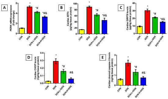 As shown in Figure 8, the DOX-intoxicated rats showed a notably upregulated PERK relative expression concomitant with elevated ATF4, GRP78, and CHOP levels relative to the CON group. Remarkably, DCN treatment abolished DOX-elicited ER stress, denoted by an observable reduction in the above-mentioned parameters in a dose-dependent manner. Concurrently, cleaved caspase-3 levels were considerably higher in the DOX group than in the CON one. Meanwhile, treatment with DCN effectively protected cardiomyocytes from DOX-aggravated apoptosis, as indicated by substantially reduced cardiac cleaved caspase-3, suggesting a potential anti-apoptotic effect of DCN.