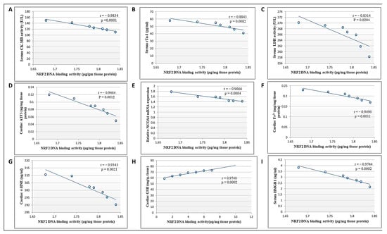 Correlation between cardiac NRF2 and other measured parameters in the DCN high-dose-treated group. (A) CK-MB activity (U/L). (B) cTn-I levels (pg/mL). (C) LDH activity (U/L). (D) ATF3 level (ng/mg protein). (E) NCOA4 mRNA level. (F) Fe2+ (mg/mg protein). (G) 4-HNE (ng/g tissue). (H) GSH content (mg/g tissue). (I) HMGB1 (ng/mL) in the high-dose DCN-treated group.