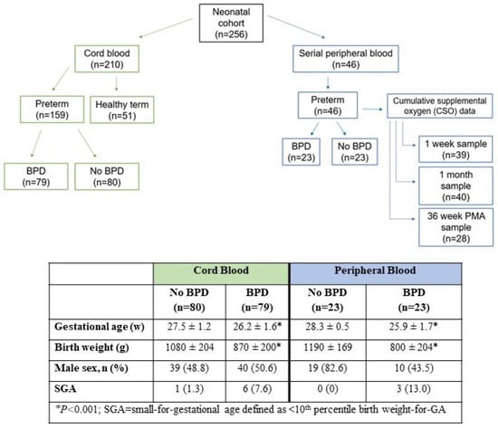 Patients were drawn from an ongoing birth cohort study conducted at Prentice Women’s Hospital (Chicago, IL, USA) from 2008 to 2021. As shown in Figure 2, there were two arms of the study: (1) The cord blood arm comprised 210 births (159 EPT and 51 FT) with corresponding archived cord blood plasma samples which were drawn from the larger birth cohort. A total of 79 BPD and 80 non-BPD infants were included in the final analysis, in addition to 51 healthy FT infants (born at ≥37 completed weeks without newborn complications) who were enrolled over the same time period. Informed consent was obtained from mothers prior to participation. The details of enrollment and sample/data collection, processing, and archive in the parent cohort have been published previously and are described elsewhere [16,17,18]. (2) The peripheral blood arm included 46 EPT infants who were followed prospectively from 2020 to 2021 with scavenged postnatal blood samples recovered from scheduled blood draws performed at 1-week, 1-month, and 36-weeks postmenstrual age (PMA). The samples were linked to clinical data throughout each patient’s NICU hospitalization, including respiratory data and cumulative supplemental oxygen exposure (see below). Informed consent was waived under a scavenged biospecimen protocol that was linked to coded data that were deidentified upon NICU discharge. There was no patient overlap between cord blood and peripheral blood arms.
