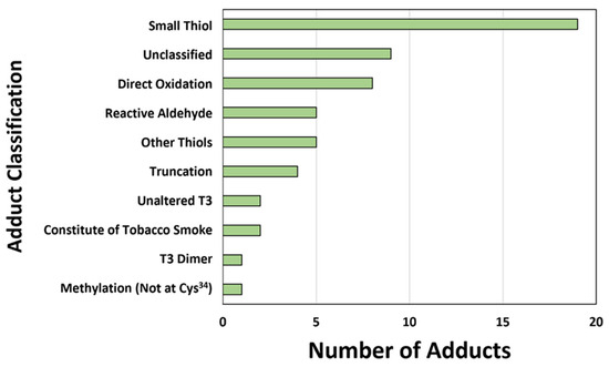 Previously annotated adduct classifications. Adducts were classified based on exogenous sources (e.g., tobacco smoke) and underlying endogenous processes (e.g., oxidative stress). Small thiols are Cys34 disulfides formed with small thiol molecules related to antioxidant capacity. Direct oxidation products are the addition of 1–3 oxygen molecules formed by reactions with Cys34 and ROS. Reactive aldehydes are reaction products formed through lipid peroxidation. Truncation products are reactions that result in the loss of mass at Cys34. Methylation (not at Cys34) refers to methyl groups added to the T3 peptide on amino acids other than Cys34. Unaltered T3 are T3 peptides in their reduced form, with no adducts on Cys34. Other disulfides are small thiols related to the microbiome and other sources not involved in antioxidant capacity. The constituents of tobacco smoke are exogenous adducts associated with tobacco smoke exposure. T3 dimers are disulfides formed between two T3 peptides.