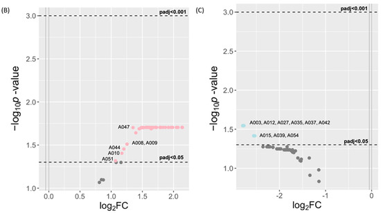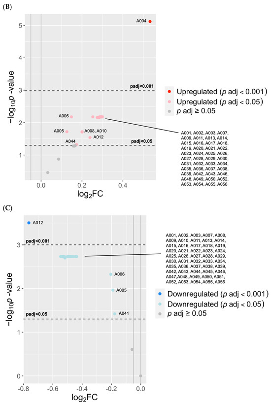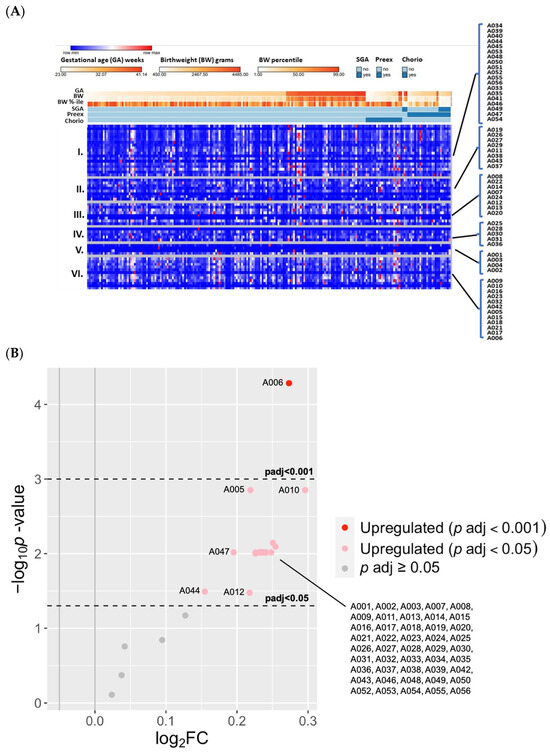 The differences in previously annotated (known) adduct concentrations according to gestational age and covariates of preterm birth. (A) A heatmap of relative concentrations of the 56 known adducts (listed on right), and grouped by (I) small thiols, (II) unclassified, (III) direct oxidation, (IV) reactive aldehydes, (V) truncation, and (VI) others. Heatmaps were generated using Morpheus https://software.broadinstitute.org/morpheus (accessed on 13 September 2023). (B) A volcano plot of upregulated known adducts with EPT versus FT infants. Significantly different adduct levels were filtered by a log fold-change of 2 and adjusted p values of Padj < 0.05 and Padj < 0.001.