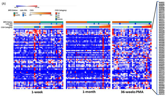 Detailed NICU data were collected on all EPT infants. This included serial information related to the primary outcome of BPD, which was defined using the modified NIH criteria [24] and included Grade I, II, III, or III(A) as determined at 36 weeks PMA. Neonatal complications of necrotizing enterocolitis (NEC), intraventricular hemorrhage (IVH), retinopathy of prematurity (ROP), and BPD-associated pulmonary hypertension (BPD-PH) were defined using our standardized protocols for the cohort, as previously published [16,18,25]. Respiratory support modes and FiO2 values at 8 h intervals (07:00, 15:00, and 23:00) were captured using automated electronic medical record algorithms. The calculation of cumulative supplemental oxygen (CSO) was adapted from a published algorithm as the sum of average daily supplemental oxygen (FiO2–0.21) over the time interval leading up to blood collection at 1-week, 1-month, and 36-weeks PMA [26]. CSO values at each timepoint were divided into quartiles and categorized for each patient as low (<25th percentile of the distribution), mild (25–50th percentile), moderate (51–75th percentile), and high CSO (>75th percentile of the distribution).