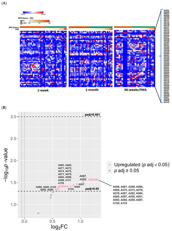 Known adducts detected in peripheral blood with cumulative supplemental oxygen (CSO) exposure and BPD. (A) A heatmap illustrating the variation in previously annotated adduct concentrations according to BPD and no BPD, and levels of CSO preceding 1-week, 1-month, and 36-weeks PMA. (B) At 1 month, there were 51 known adducts (red) associated with high CSO compared to low CSO (4th quartile versus 1st quartile, respectively; at least 2.1 FC; Padj < 0.05). (C) At 36 weeks, 9 adducts were significantly decreased (blue) with high CSO exposure. Grey dots indicate adducts that were not significant (p > 0.05).