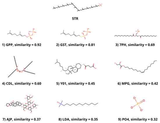 The molecular similarity between the ligands that are bound to the selected structures and PHB or a similar molecule bound to DPP, 5TR, was determined. PHB is present in 4OD5_A, but no similar ligand was found in any other selected structure. The most similar molecule to 5TR was geranyl diphosphate (GPP), which was bound to 4TQ3_B, with a Tanimoto coefficient of 0.92. The molecule with the second highest Tanimoto coefficient (0.81) was geranyl S-thiolodiphosphate (GST), which was present in 4OD5_A. Other ligands with a coefficient value higher than 0.3 were phosphatidic acid (7PH) and cardiolipin (CDL) from 7Q21_f; cholesterol hemisuccinate (Y01) and digitonin (AJP) from 8DJM_B; and [(Z)-octadec-9-enyl] (2R)-2,3-bis(oxidanyl)propanoate (MPG), lauryl dimethylamine-n-oxide (LDA) and phosphate ion (PO4) from 6M31_B (Figure 1).