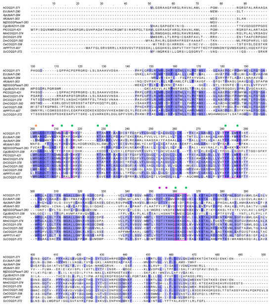 Multiple sequence alignment of human COQ2 (hCOQ2) and some homologs from different organisms, including UbiA from E. coli (EcUbiA), UbiA homolog from A. pernix (ApUbiA), UbiA homolog from A. fulgidus (AfUbiA), DGGGPase from M. jannaschii (MjDGGGPase), UBIAD1 homolog from C. griseus (CgUBIAD1), COQ2 from Pan troglodytes (PtCOQ2), COQ2 from Mus musculus (MmCOQ2), COQ2 from Danio rerio (DrCOQ2), COQ2 from Drosophila melanogaster (DmCOQ2), COQ2 from Caenorhabditis elegans (CeCOQ2), PPT1 from Arabidopsis thaliana (AtPPT1) and COQ2 from Saccharomyces cerevisiae (ScCOQ2). The degree of sequence conservation is indicated in shades of blue: dark (>80%), medium (>60%) and light (>40%). Conserved motifs are represented in pink boxes. Residues located in the proximity of the PPi group and the C1 atom of the tail precursor are denoted by green and purple dots, respectively. The residue associated with PHB binding is depicted with an orange dot.