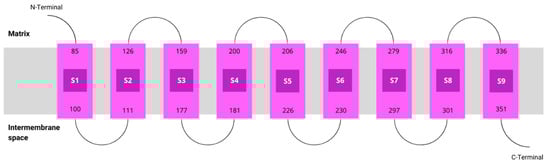 According to MEMSAT, hCOQ2 is predicted to contain nine transmembrane regions, called S1–S9. The N-terminal (which bears the signal peptide) and the loops connecting S2–S3, S4–S5, S6–S7 and S8–S9 face the matrix side of the inner mitochondrial membrane, whereas the C-terminal and the loops between S1 and S2, S3 and S4, S5 and S6, and S7 and S8 lie on the intermembrane space (Figure 3).