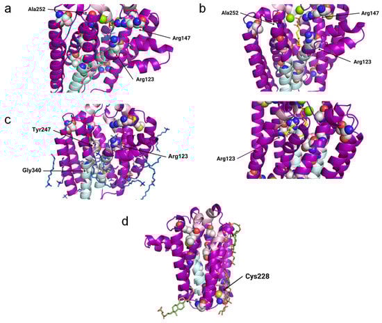 In the 4TQ3_B structure (AfUbiA), the GPP is located inside the central cavity, with the PPi group located at the matrix side. The above-indicated conserved motifs and two Mg2+ ions are in the proximity of the PPi group. Three residues that are mutated in CoQ primary deficiency patients are close to GPP: Arg123, Arg147 and Ala252, all of which are predicted to be pathogenic (Figure 7a).