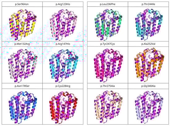 Structural superposition of variants associated with primary CoQ deficiency onto the COQ2 model. Each structure is represented in a different color: p.Ser96Asn (yellow), p.Arg123His (pink), p.Met132Arg (grey), p.Arg147His (cyan), p.Asn178Ser (blue), p.Cys228Arg (red), p.Leu236Phe (green), p.Thr244Ile (teal), p.Tyr247Cys (magenta), p.Ala252Val (orange), p.Thr275Ala (wheat), p.Gly340Ala (light blue) and wild-type (purple).