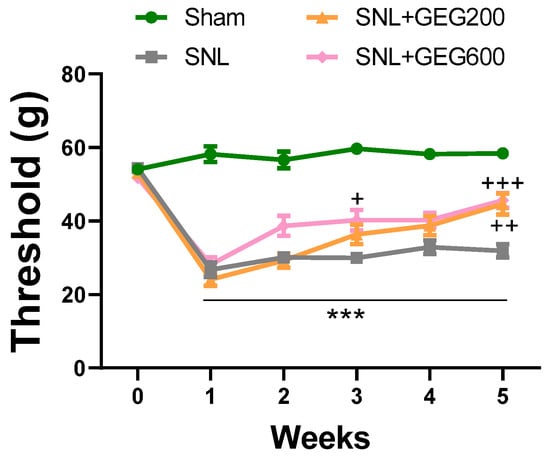 Effects of GEG on mechanical hypersensitivity. Mechanical hypersensitivity of the left hind paw was assessed by an electronic von Frey anesthesiometer. Data expressed as mean ± SEM. n = 9 per group. SNL rats showed significantly decreased mechanical thresholds, indicating that SNL surgery induced pain-related hypersensitivity (*** p < 0.001 compared with sham, two-way ANOVA with Tukey’s multiple comparisons test, n = 9). SNL + GEG200-group rats and SNL + GEG600 group rats showed significantly increased mechanical thresholds (+ p < 0.05, ++ p < 0.01, +++ p < 0.001 compared with SNL, two-way ANOVA with Tukey’s multiple comparisons test, n = 9), indicating that GEG200 or GEG600 application reduced pain-related hypersensitivity.