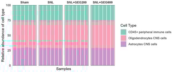 We examined the cell type, gene expression, and pathways involved in neuroinflammation and GEG effects and focused on the amygdala because it plays an important role in pain modulation [19]. To achieve this, we used the NanoString nCounter® Neuroinflammation Panel (NanoString Technologies, Inc., Seattle, WA, USA) to profile changes. One of the key outputs of the NanoString nCounter® Neuroinflammation Panel is to measure the relative abundance of 5 CNS cell types and 14 peripheral immune cell types with the unique cell-profiling feature. Based on the analysis performed within ROSALIND, three neuroinflammation cell types were identified, namely CD45+ peripheral immune cells, oligodendrocyte CNS cells, and astrocyte CNS cells (Figure 2). In general, oligodendrocytes CNS cells were the most abundant cell type (~50%) across all samples. However, the relative abundance of all three cell types was comparable between groups (ANOVA, p > 0.05).