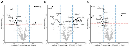 Differential expression of neuroinflammation-related genes between groups. Volcano plots of (A) SNL vs. sham, (B) SNL + GEG200 vs. SNL, and (C) SNL + GEG600 vs. SNL show −log10(p-value) on the y-axis and log 2-fold change in gene expression on the x-axis. Statistical significance cutoffs are indicated by a red horizontal dashed line at a p-value of 0.05 and blue vertical dashed lines at a fold change of 1.25. Abbreviations: Abcc8, ATP-binding cassette subfamily C member 8; Arc, activity-regulated cytoskeleton-associated protein; Bag3, BAG cochaperone 3; Birc5, baculoviral IAP repeat-containing 5; Bok, BCL2 family apoptosis regulator; Ccl2, C-C motif chemokine ligand 2; Cd68, CD68 molecule; Chek2, checkpoint kinase 2; Cotl1, coactosin-like F-actin-binding protein 1; E2f1, E2F transcription factor 1; Fgd2, FYVE, RhoGEF and PH domain-containing 2; Fos, FBJ osteosarcoma oncogene; Gadd45g, growth arrest and DNA-damage-inducible 45 gamma; Gdpd2, glycerophosphodiester phosphodiesterase domain-containing 2; Gpr84, G protein-coupled receptor 84; Hdac2, histone deacetylase 2; Hdac4, histone deacetylase 4; Hspb1, heat shock protein family B (small) member 1; Igf1, insulin-like growth factor-I; Ldha, lactate dehydrogenase A; ncf1, neutrophil cytosolic factor 1; Nfkb2, nuclear factor kappa B subunit 2; Nthl1, nth-like DNA glycosylase 1; Pik3cg, phosphatidylinositol-4,5-bisphosphate 3-kinase catalytic subunit gamma; Rtn4rl1, reticulon 4 receptor-like 1; Shank3, SH3 and multiple ankyrin repeat domains 3; Slc17a6, solute carrier family 17 member 6; Top2a, DNA topoisomerase II alpha; Trpm4, transient receptor potential cation channel subfamily M member 4.